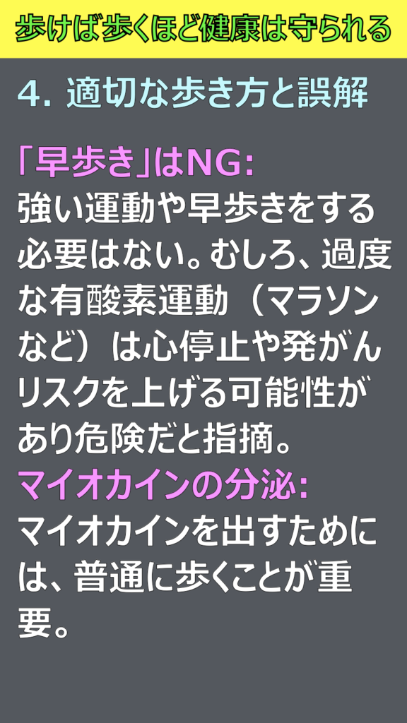 マイオカインの分泌: マイオカインを出すためには、普通に歩くことが重要。