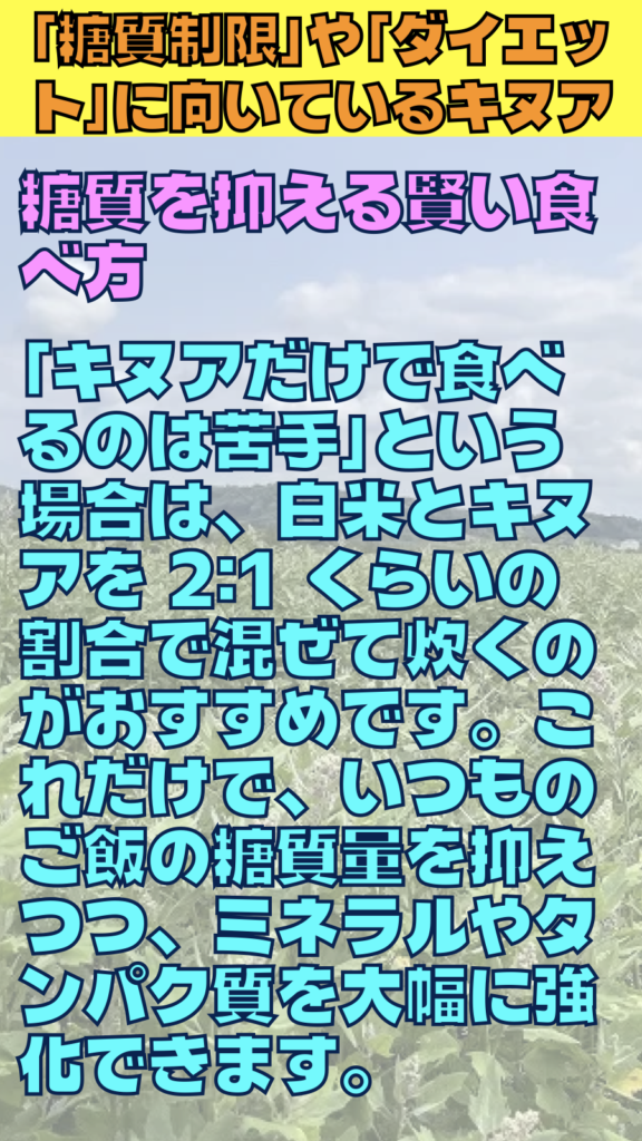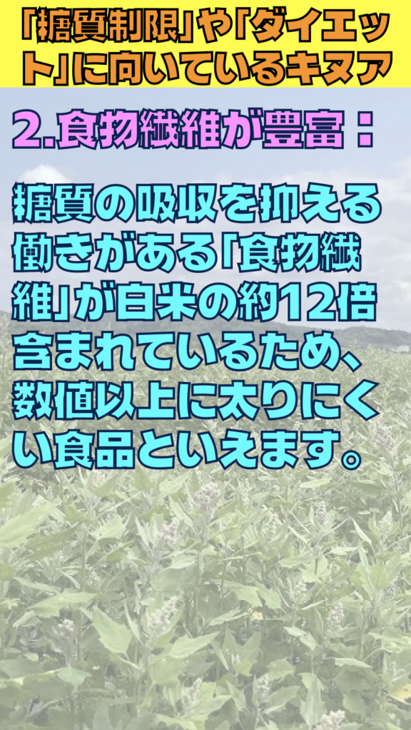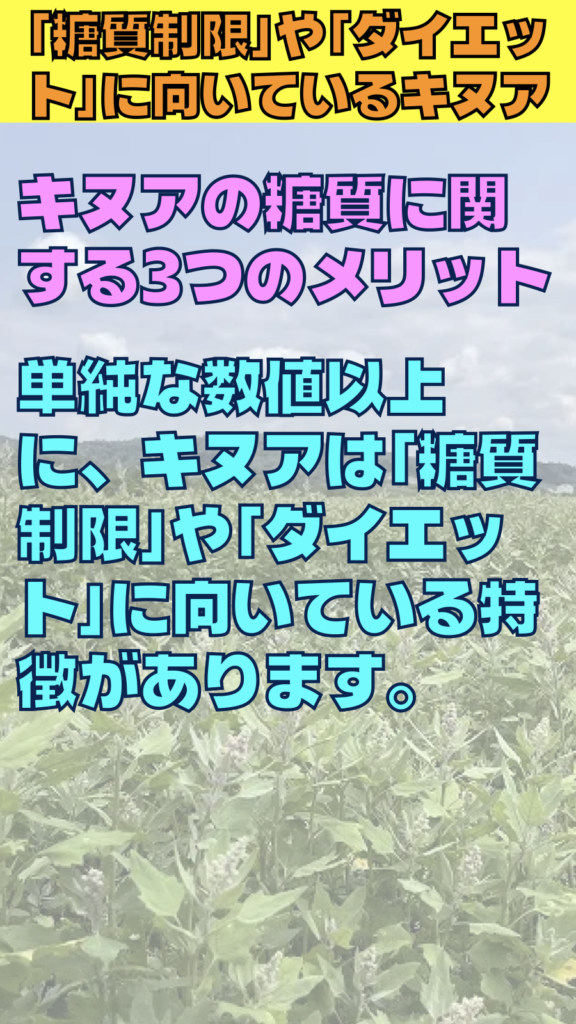 単純な数値以上に、キヌアは「糖質制限」や「ダイエット」に向いている特徴があります。