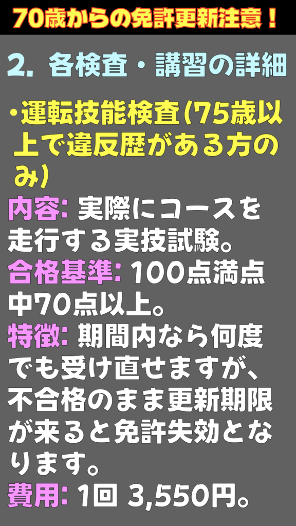 - 一定の違反歴(過去3年以内)がある場合は、さらに運転技能検査(実技試験)が必要です。