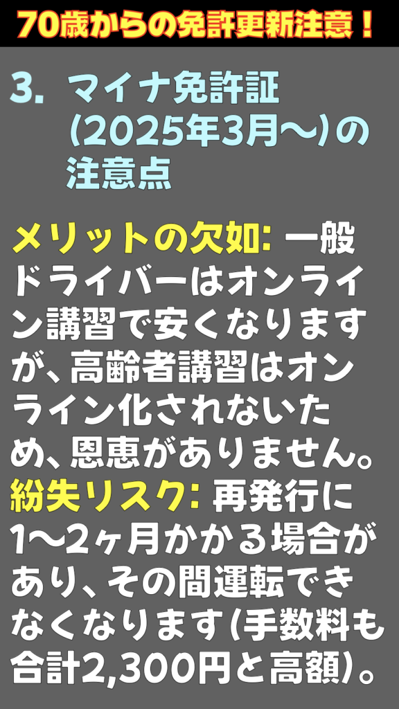 - 紛失リスク: 再発行に1〜2ヶ月かかる場合があり、その間運転できなくなります(手数料も合計2,300円と高額)。