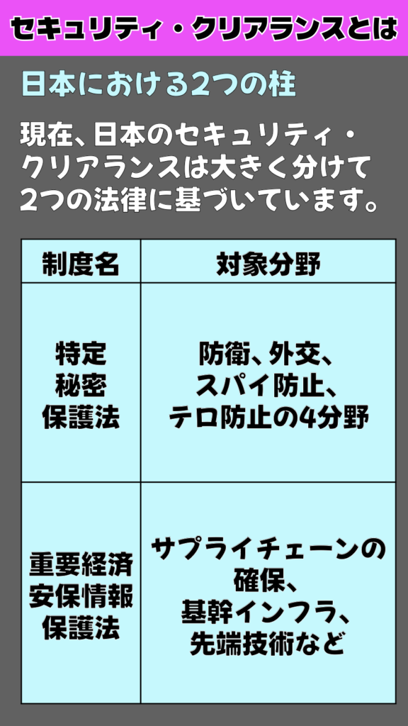現在、日本のセキュリティ・クリアランスは大きく分けて2つの法律に基づいています。