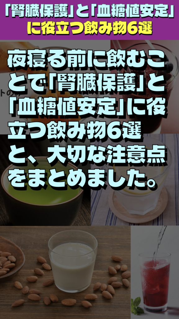 夜寝る前に飲むことで「腎臓保護」と「血糖値安定」に役立つ飲み物6選と、大切な注意点をまとめました。
