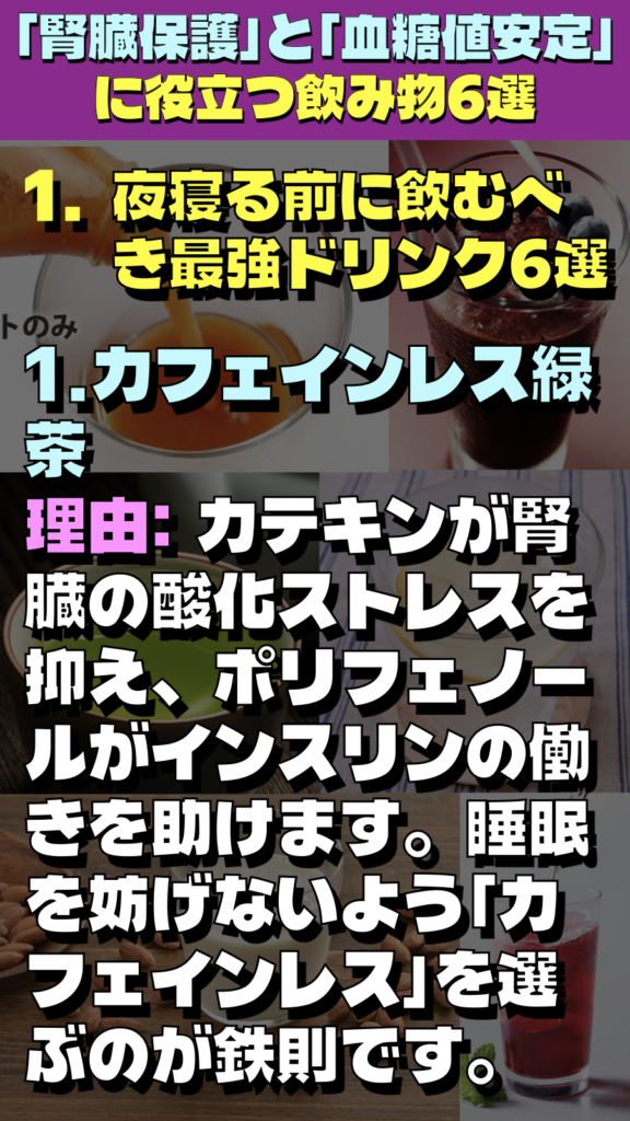 - 理由: カテキンが腎臓の酸化ストレスを抑え、ポリフェノールがインスリンの働きを助けます。睡眠を妨げないよう「カフェインレス」を選ぶのが鉄則です。