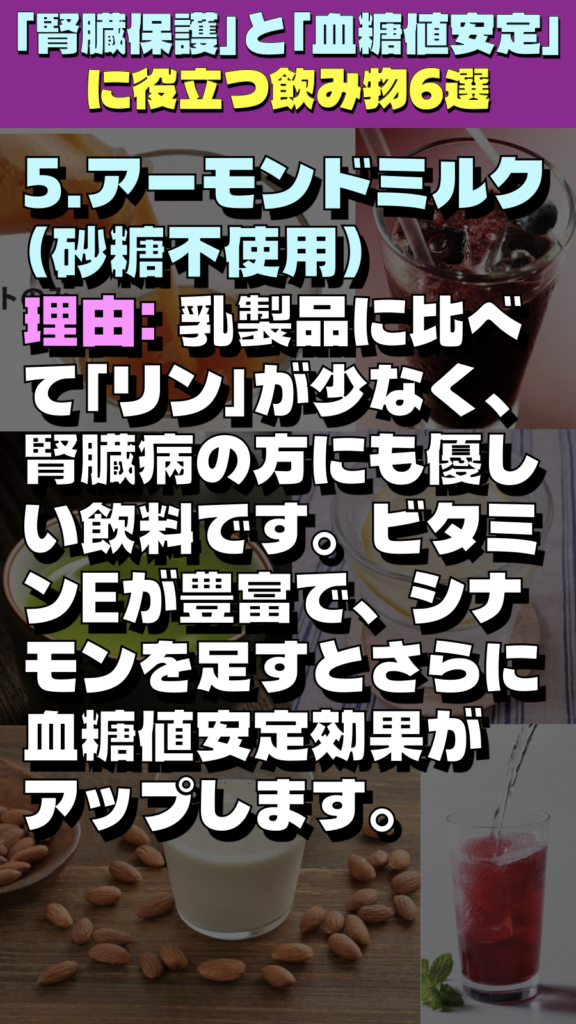 - 理由: 乳製品に比べて「リン」が少なく、腎臓病の方にも優しい飲料です。ビタミンEが豊富で、シナモンを足すとさらに血糖値安定効果がアップします。