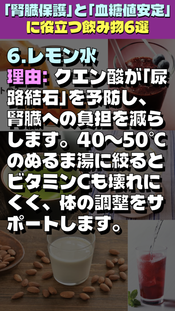 - 理由: クエン酸が「尿路結石」を予防し、腎臓への負担を減らします。40〜50℃のぬるま湯に絞るとビタミンCも壊れにくく、体の調整をサポートします。