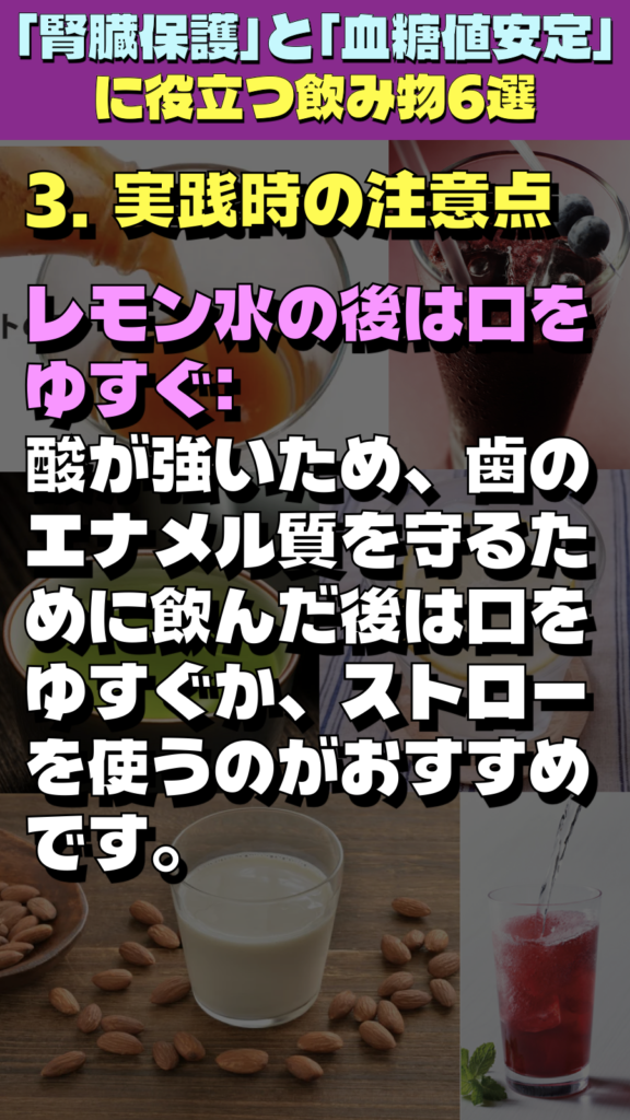 - レモン水の後は口をゆすぐ: 酸が強いため、歯のエナメル質を守るために飲んだ後は口をゆすぐか、ストローを使うのがおすすめです。