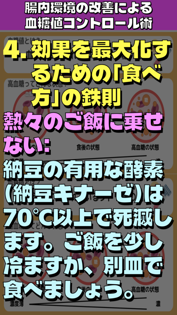 - 納豆ファースト: 食事の最初に食べることで、後から入る炭水化物の吸収を穏やかにできます。