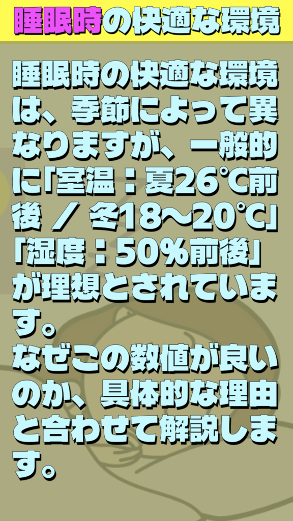 睡眠時の快適な環境は、季節によって異なりますが、一般的に**「室温:夏26℃前後 / 冬18〜20℃」「湿度:50%前後」**が理想とされています。