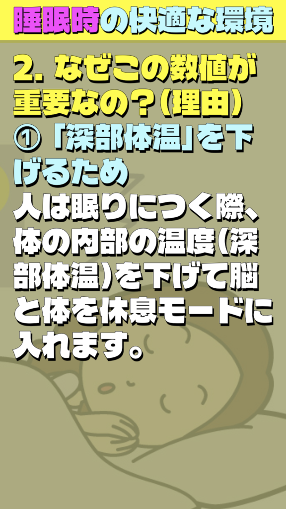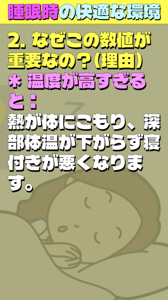 * 温度が高すぎると: 熱が体にこもり、深部体温が下がらず寝付きが悪くなります。