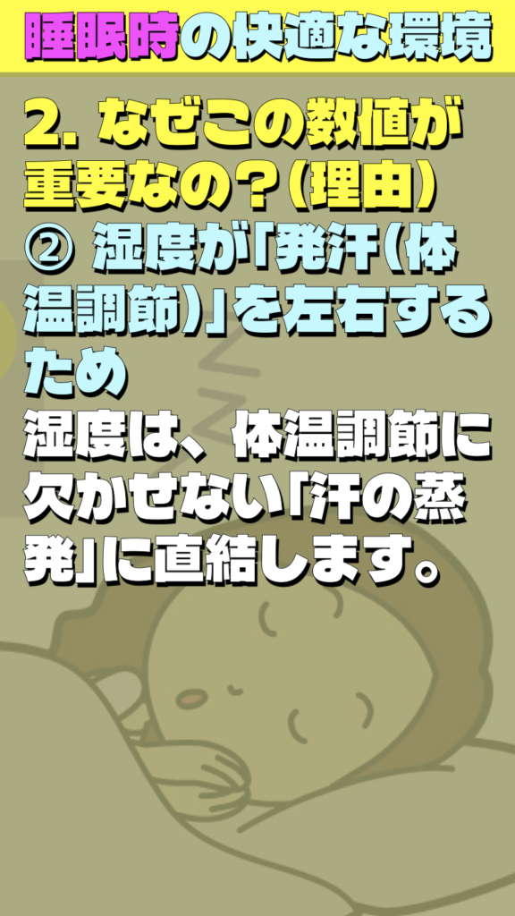 * 湿度が高すぎると: 汗が蒸発せず、ベタつきや不快感(蒸れ)が生じ、睡眠が浅くなります。