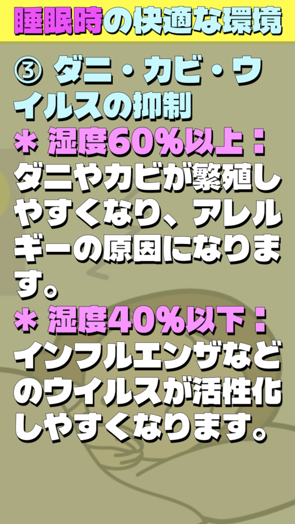 * 湿度60%以上: ダニやカビが繁殖しやすくなり、アレルギーの原因になります。