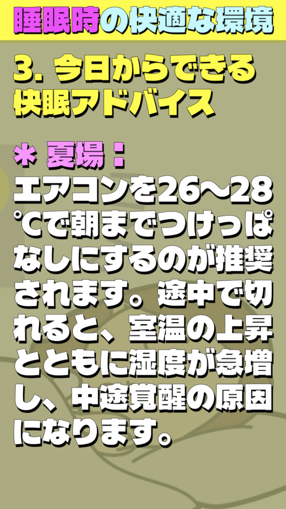 * 夏場: エアコンを26〜28℃で朝までつけっぱなしにするのが推奨されます。途中で切れると、室温の上昇とともに湿度が急増し、中途覚醒の原因になります。