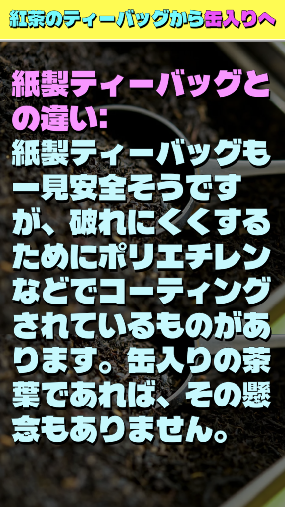 紙製ティーバッグとの違い:紙製ティーバッグも一見安全そうですが、破れにくくするためにポリエチレンなどでコーティングされているものがあります。缶入りの茶葉であれば、その懸念もありません。