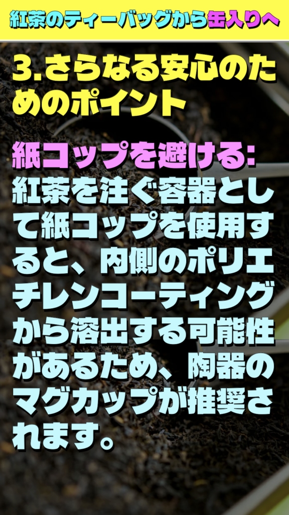 紙コップを避ける:紅茶を注ぐ容器として紙コップを使用すると、内側のポリエチレンコーティングから溶出する可能性があるため、陶器のマグカップが推奨されます。