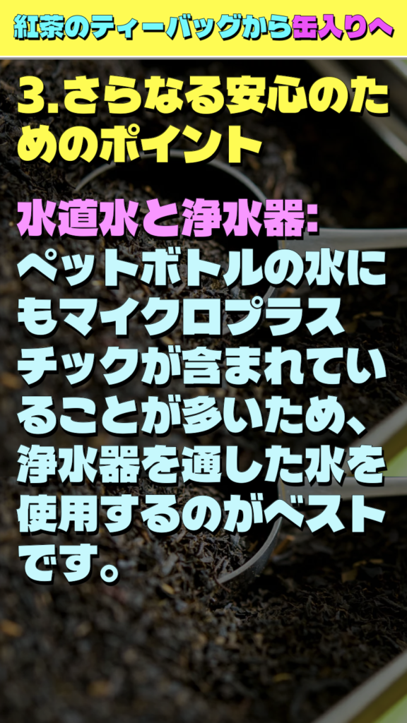 水道水と浄水器:ペットボトルの水にもマイクロプラスチックが含まれていることが多いため、浄水器を通した水を使用するのがベストです。