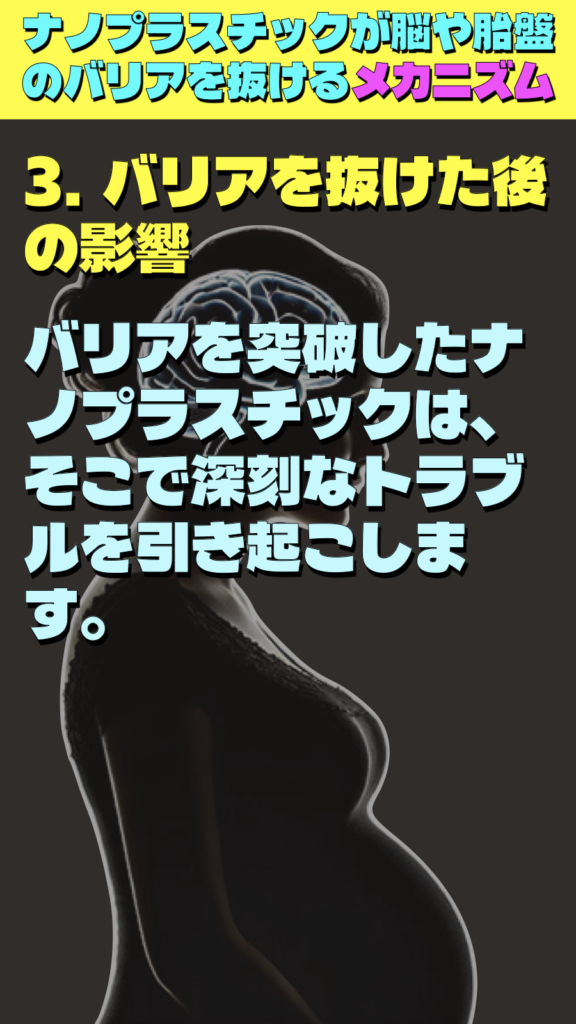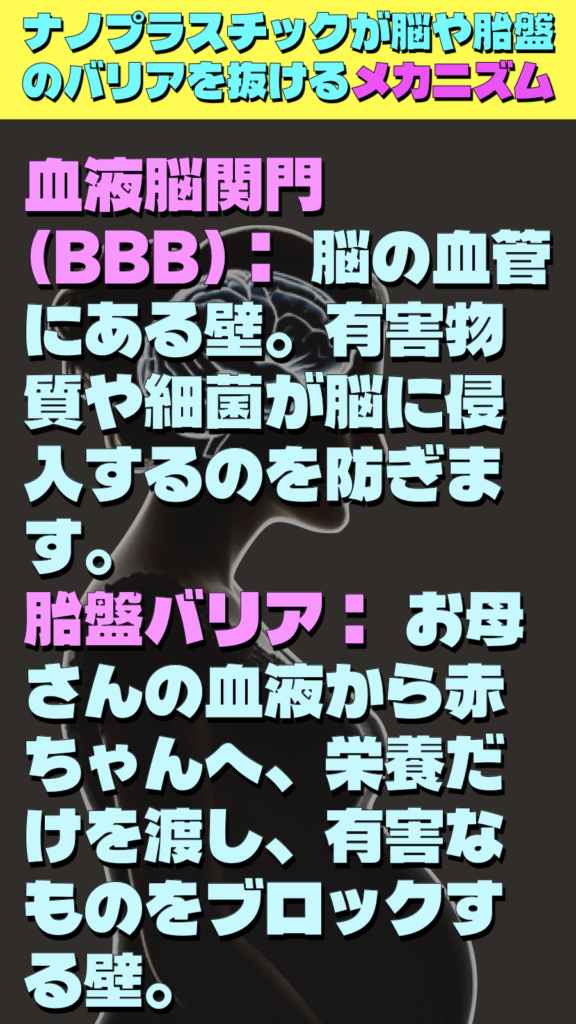 ナノプラスチック(1μm未満の超微細粒子)が、本来は異物を中に入れないはずの「脳」や「胎盤」の強力なバリアをどのように突破してしまうのか、その驚くべき仕組みを解説します。