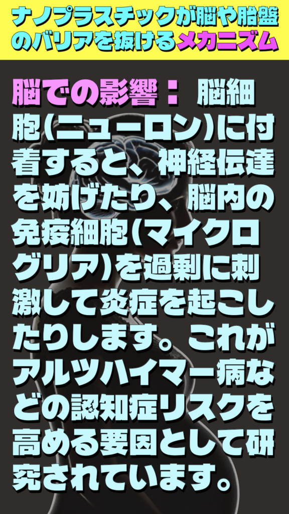 * 脳での影響: 脳細胞(ニューロン)に付着すると、神経伝達を妨げたり、脳内の免疫細胞(マイクログリア)を過剰に刺激して炎症を起こしたりします。これがアルツハイマー病などの認知症リスクを高める要因として研究されています。