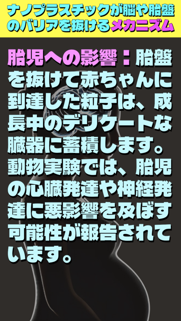 * 胎児への影響: 胎盤を抜けて赤ちゃんに到達した粒子は、成長中のデリケートな臓器に蓄積します。動物実験では、胎児の心臓発達や神経発達に悪影響を及ぼす可能性が報告されています。