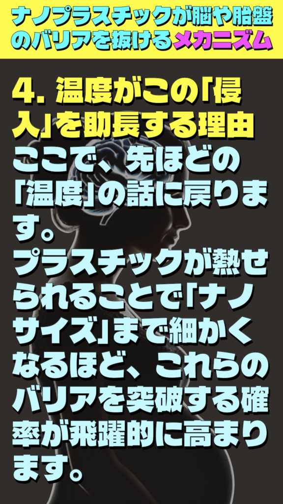 プラスチックが熱せられることで「ナノサイズ」まで細かくなるほど、これらのバリアを突破する確率が飛躍的に高まります。