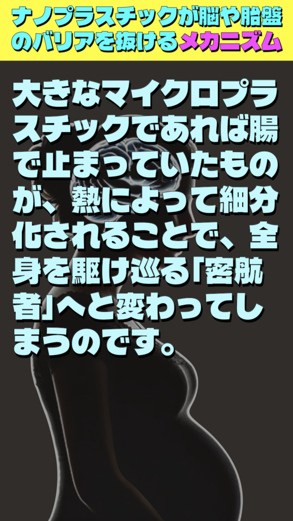 大きなマイクロプラスチックであれば腸で止まっていたものが、熱によって細分化されることで、全身を駆け巡る「密航者」へと変わってしまうのです。