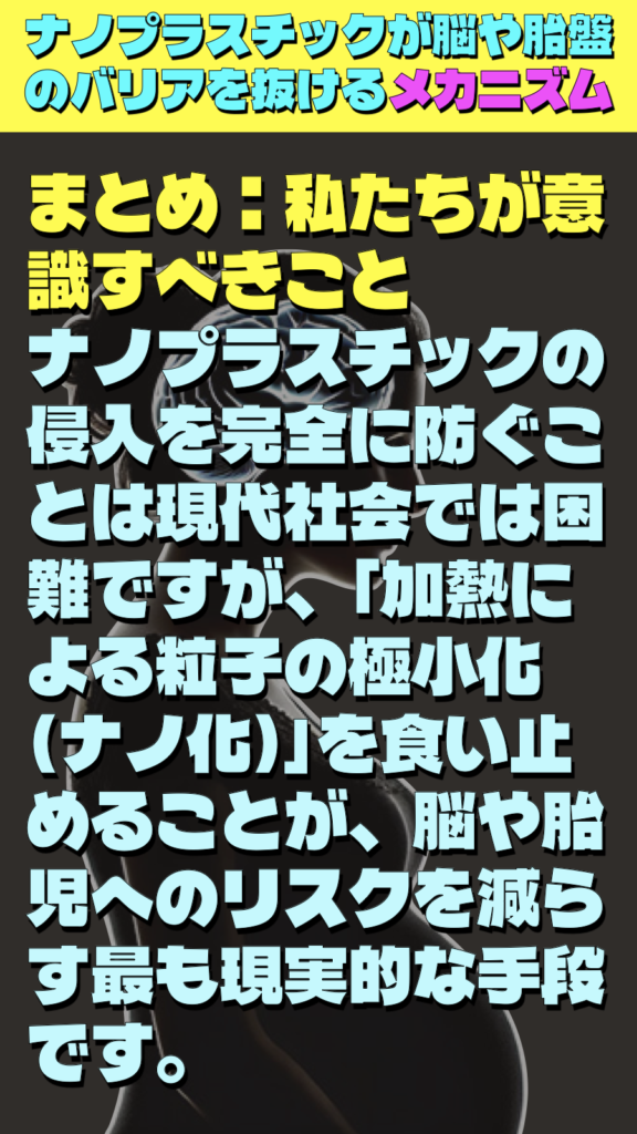 ナノプラスチックの侵入を完全に防ぐことは現代社会では困難ですが、「加熱による粒子の極小化(ナノ化)」を食い止めることが、脳や胎児へのリスクを減らす最も現実的な手段です。