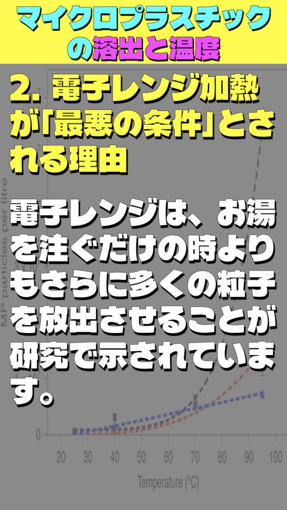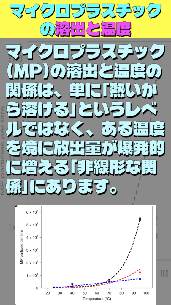 マイクロプラスチック(MP)の溶出と温度の関係は、単に「熱いから溶ける」というレベルではなく、**ある温度を境に放出量が爆発的に増える「非線形な関係」**にあります。