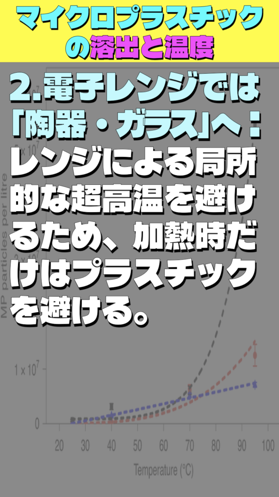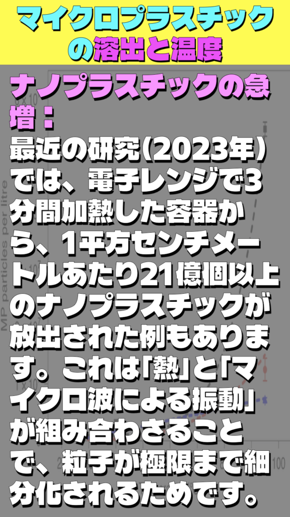 電子レンジは食品内の分子を振動させて発熱させるため、プラスチックと食品が接する境界で局所的に**150℃~200℃を超える高温(ヒートスポット)**が発生することがあります。 - ナノプラスチックの急増: