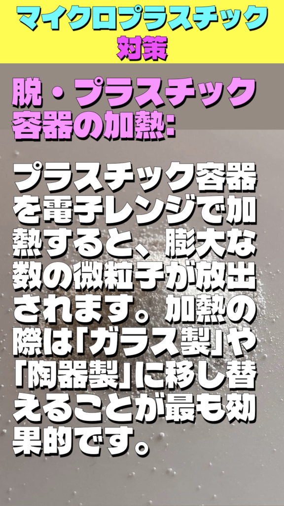 - 脱・プラスチック容器の加熱: プラスチック容器を電子レンジで加熱すると、膨大な数の微粒子が放出されます。加熱の際は**「ガラス製」や「陶器製」**に移し替えることが最も効果的です。