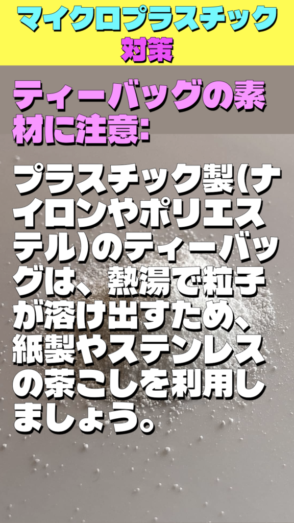 - ティーバッグの素材に注意: プラスチック製(ナイロンやポリエステル)のティーバッグは、熱湯で粒子が溶け出すため、紙製やステンレスの茶こしを利用しましょう。