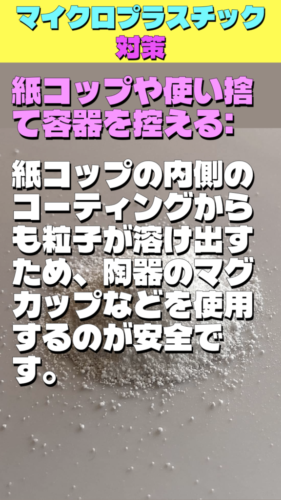 - 紙コップや使い捨て容器を控える: 紙コップの内側のコーティングからも粒子が溶け出すため、陶器のマグカップなどを使用するのが安全です。