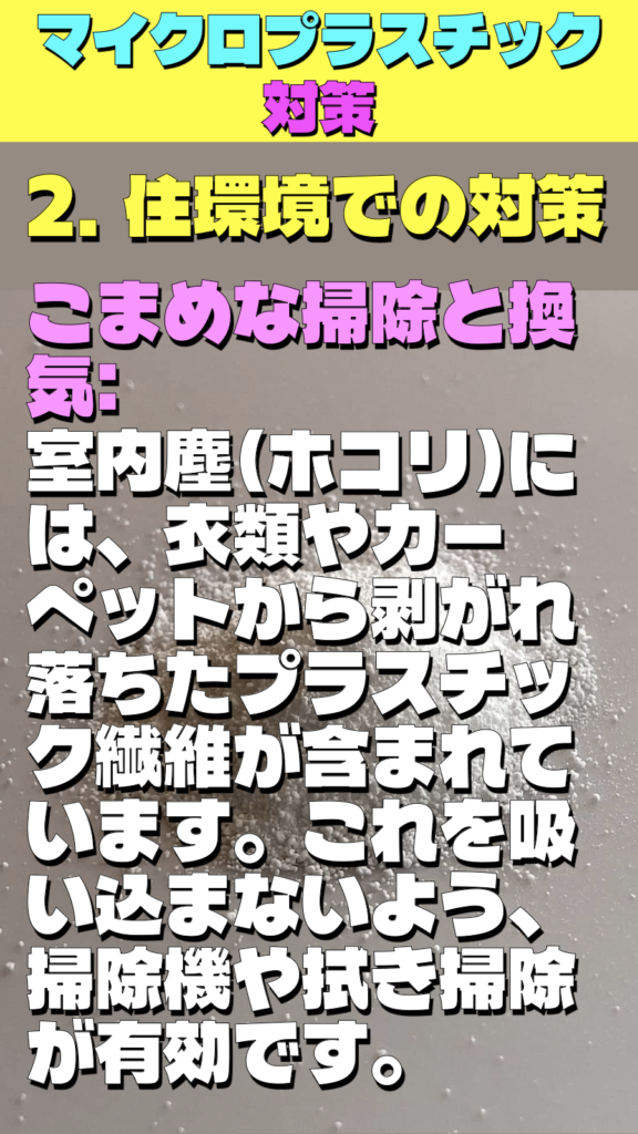 - こまめな掃除と換気: 室内塵(ホコリ)には、衣類やカーペットから剥がれ落ちたプラスチック繊維が含まれています。これを吸い込まないよう、掃除機や拭き掃除が有効です。