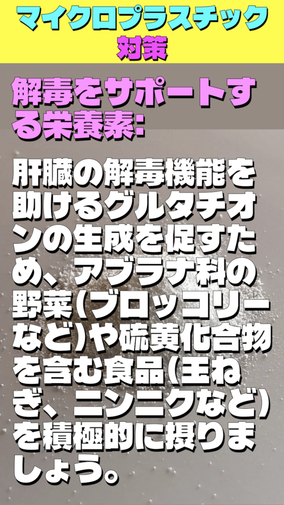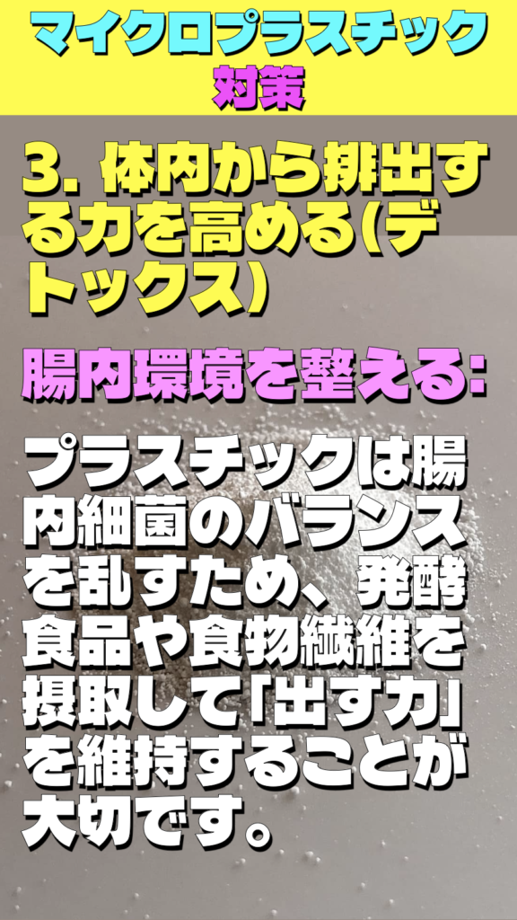 - 腸内環境を整える: プラスチックは腸内細菌のバランスを乱すため、発酵食品や食物繊維を摂取して「出す力」を維持することが大切です。