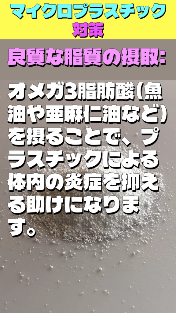 - 良質な脂質の摂取: オメガ3脂肪酸(魚油や亜麻仁油など)を摂ることで、プラスチックによる体内の炎症を抑える助けになります。