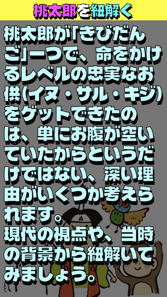 桃太郎が「きびだんご」一つで、命をかけるレベルの忠実なお供(イヌ・サル・キジ)をゲットできたのは、単にお腹が空いていたからというだけではない、深い理由がいくつか考えられます。