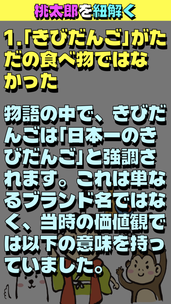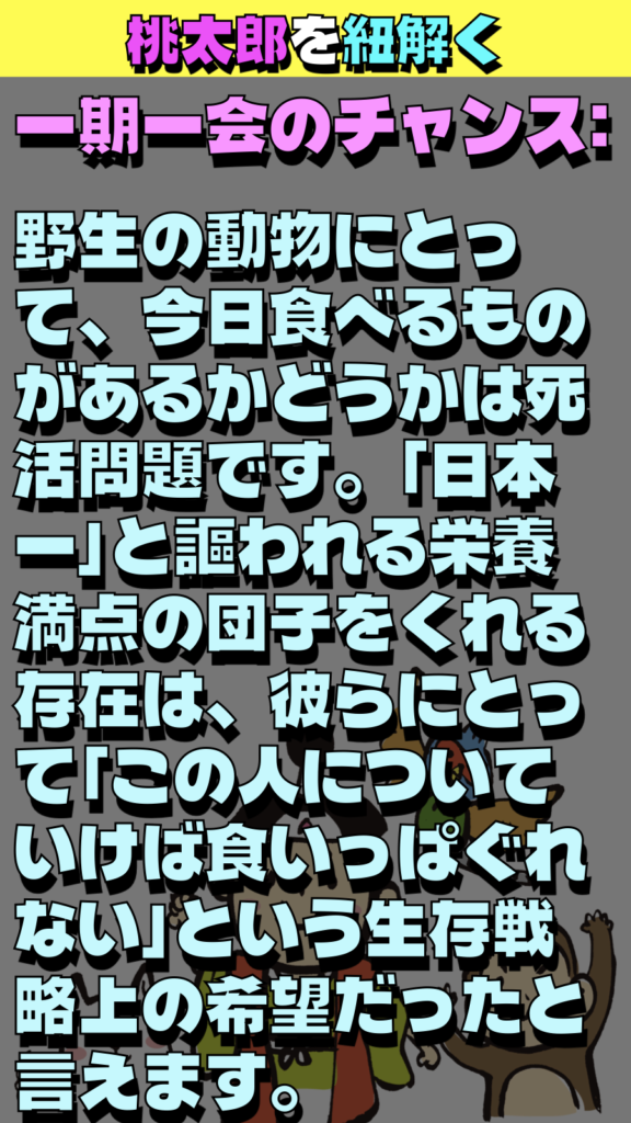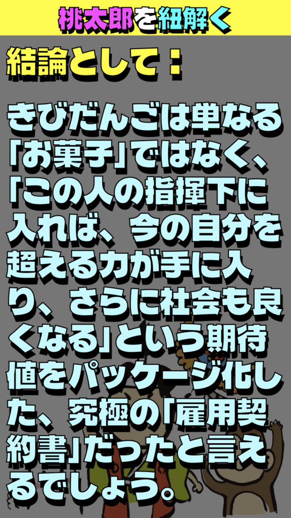 > きびだんごは単なる「お菓子」ではなく、**「この人の指揮下に入れば、今の自分を超える力が手に入り、さらに社会も良くなる」**という期待値をパッケージ化した、究極の「雇用契約書」だったと言えるでしょう。