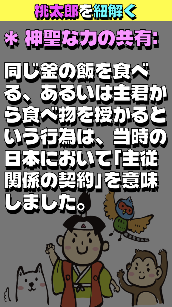 * 神聖な力の共有: 同じ釜の飯を食べる、あるいは主君から食べ物を授かるという行為は、当時の日本において**「主従関係の契約」**を意味しました。