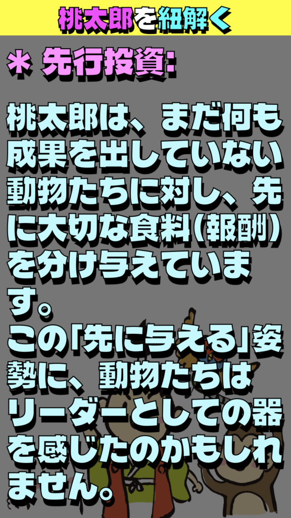 * 先行投資: 桃太郎は、まだ何も成果を出していない動物たちに対し、先に大切な食料(報酬)を分け与えています。この**「先に与える」姿勢**に、動物たちはリーダーとしての器を感じたのかもしれません。
