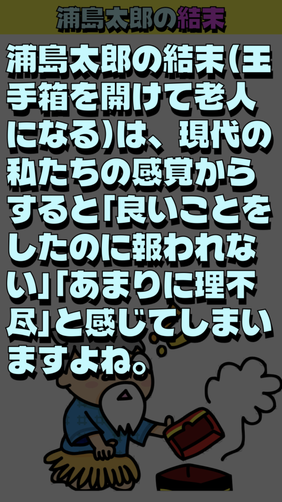 浦島太郎の結末(玉手箱を開けて老人になる)は、現代の私たちの感覚からすると「良いことをしたのに報われない」「あまりに理不尽」と感じてしまいますよね。