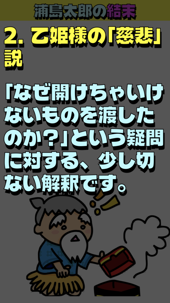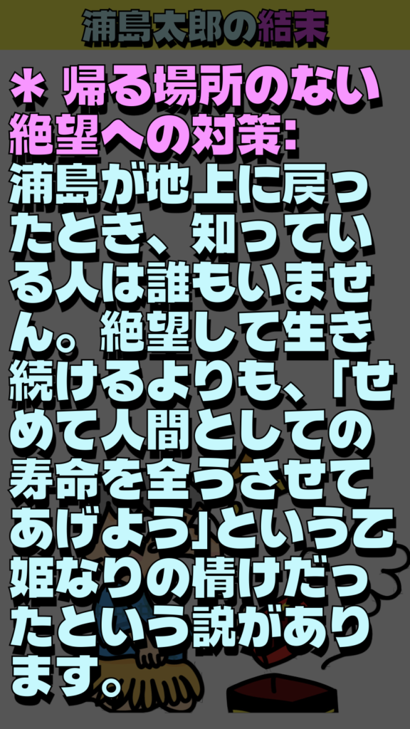 * 帰る場所のない絶望への対策: 浦島が地上に戻ったとき、知っている人は誰もいません。絶望して生き続けるよりも、**「せめて人間としての寿命を全うさせてあげよう」**という乙姫なりの情けだったという説があります。