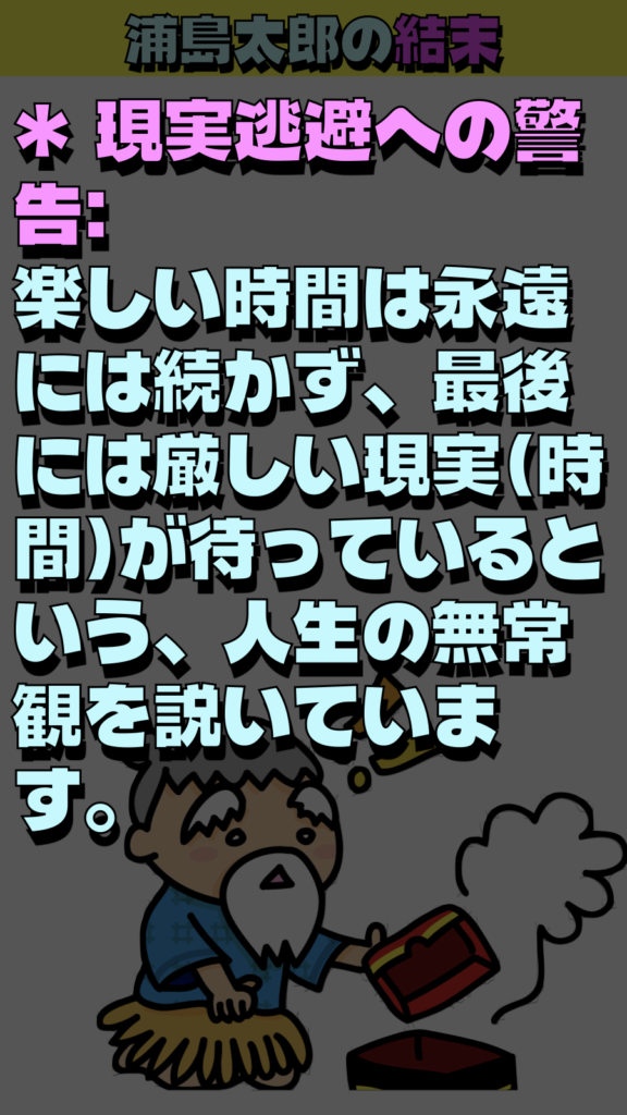 * 玉手箱は「時間の貯金箱」: 乙姫様が渡した玉手箱には、**「浦島が地上で過ごすべきだったはずの時間」**が封じ込められていました。