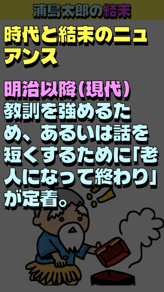 | 明治以降(現代) | 教訓を強めるため、あるいは話を短くするために「老人になって終わり」が定着。 |