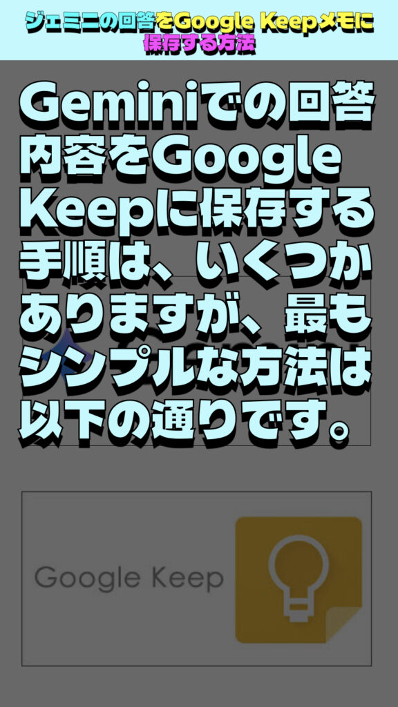 Geminiでの回答内容をGoogle Keepに保存する手順は、いくつかありますが、最もシンプルな方法は以下の通りです。