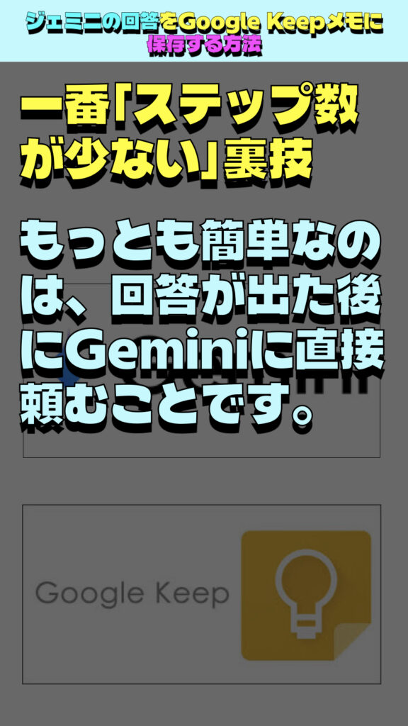 もっとも簡単なのは、回答が出た後に「これをGoogle Keepに保存して」とGeminiに直接頼むことです。