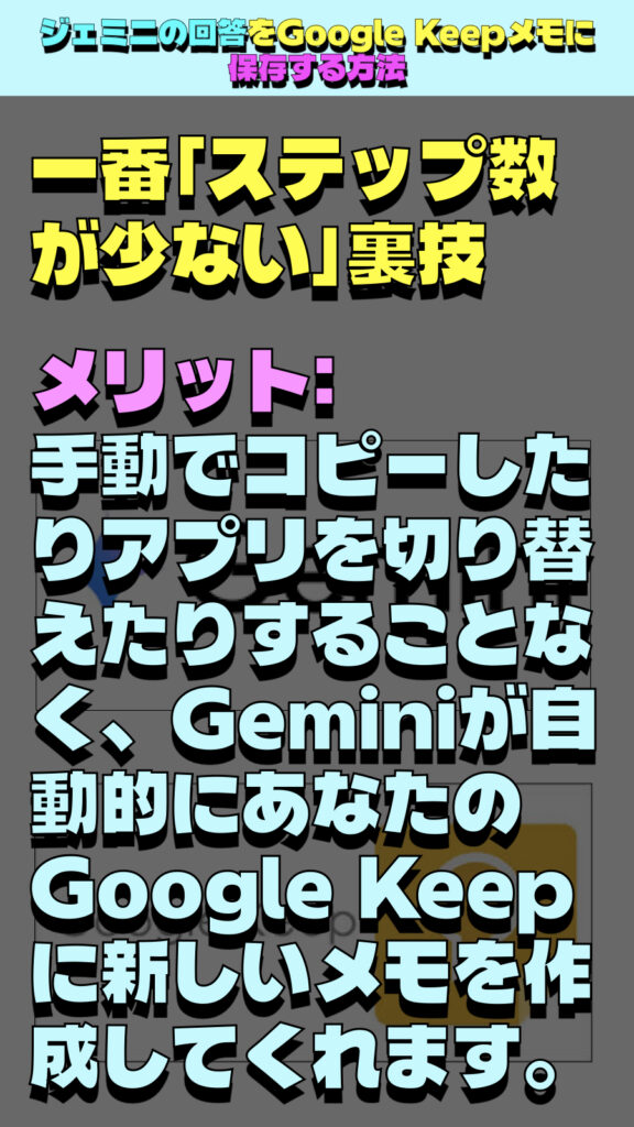 メリット: 手動でコピーしたりアプリを切り替えたりすることなく、Geminiが自動的にあなたのGoogle Keepに新しいメモを作成してくれます。