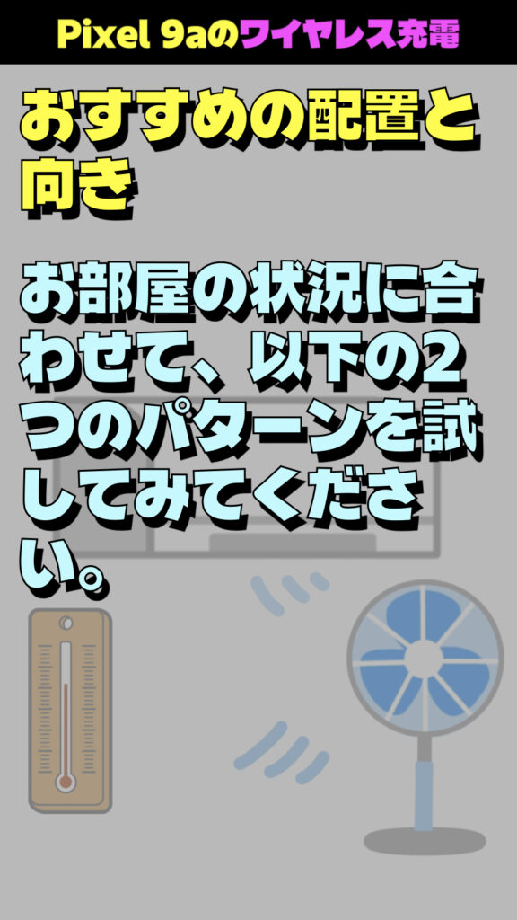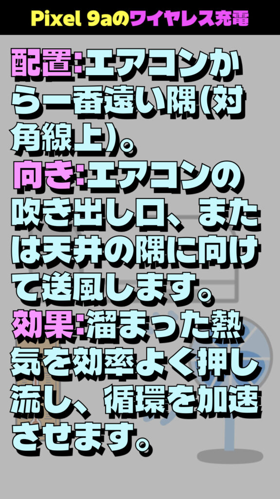 * 配置: 部屋の中央、またはエアコンの対角線上。