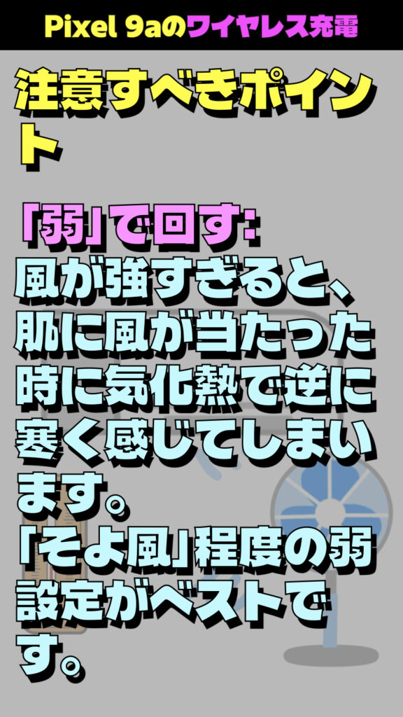 * 「弱」で回す: 風が強すぎると、肌に風が当たった時に気化熱で逆に寒く感じてしまいます。「そよ風」程度の弱設定がベストです。