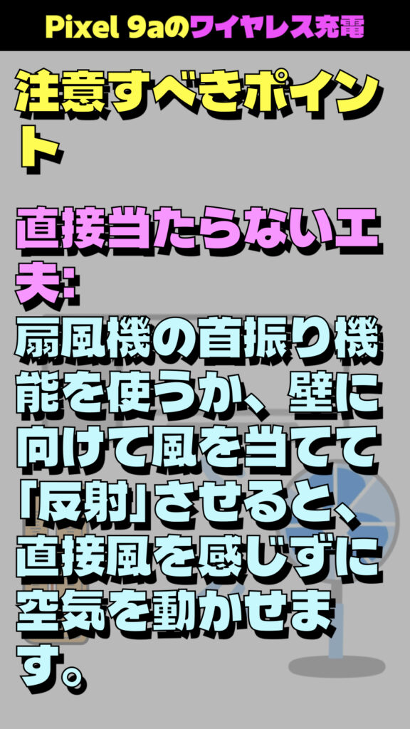 * 直接当たらない工夫: 扇風機の首振り機能を使うか、壁に向けて風を当てて「反射」させると、直接風を感じずに空気を動かせます。