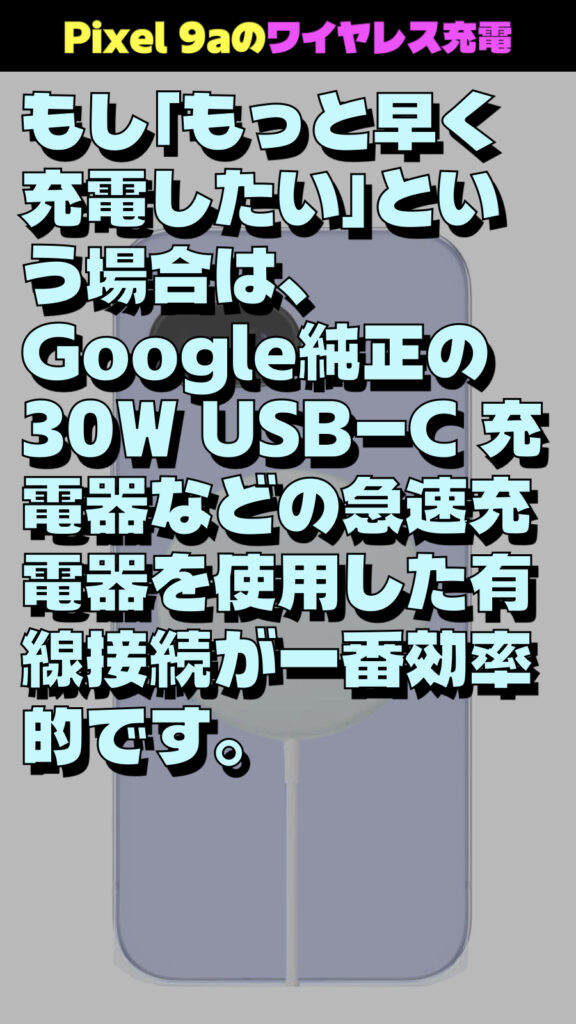 もし「もっと早く充電したい」という場合は、Google純正の 30W USB-C 充電器 などの急速充電器を使用した有線接続が一番効率的です。