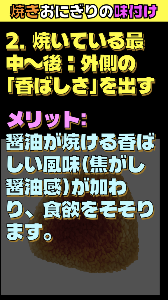 * メリット: 醤油が焼ける香ばしい風味(焦がし醤油感)が加わり、食欲をそそります。