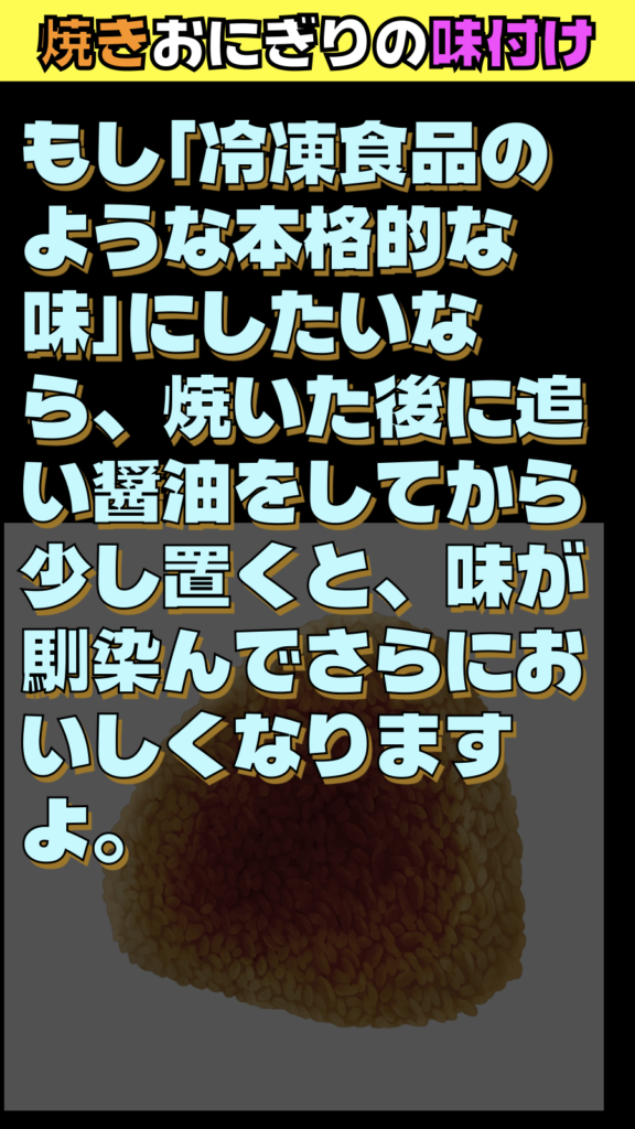 もし「冷凍食品のような本格的な味」にしたいなら、焼いた後に追い醤油をしてから少し置くと、味が馴染んでさらにおいしくなりますよ。